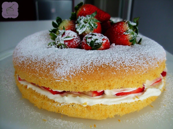 9° Si nos quedan fresas, las podemos poner en el bizcocho para decorar además de espolvorearlo con azúcar glace.