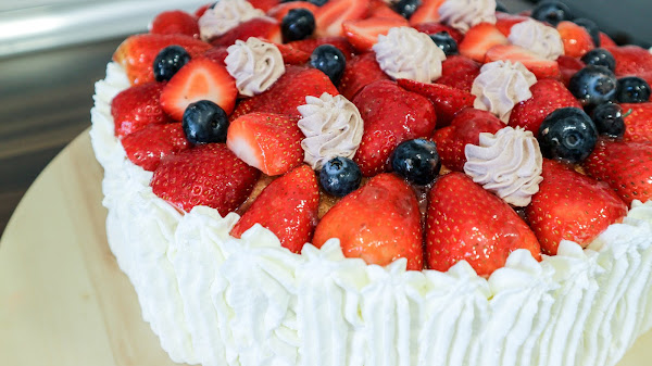 4º Empezaremos poniendo una capa de bizcocho, después la cubriremos con nata montada (crema de leche), sobre esta añadiremos las fresas picadas, a continuación haremos lo mismo pero esta vez pondremos la trufa junto las fresas, la siguiente capa será igual que la primera con bizcocho, nata (crema de leche) y fresas por ultimo taparemos con otra capa de bizcocho en total hemos usado 4 capas de bizcocho.