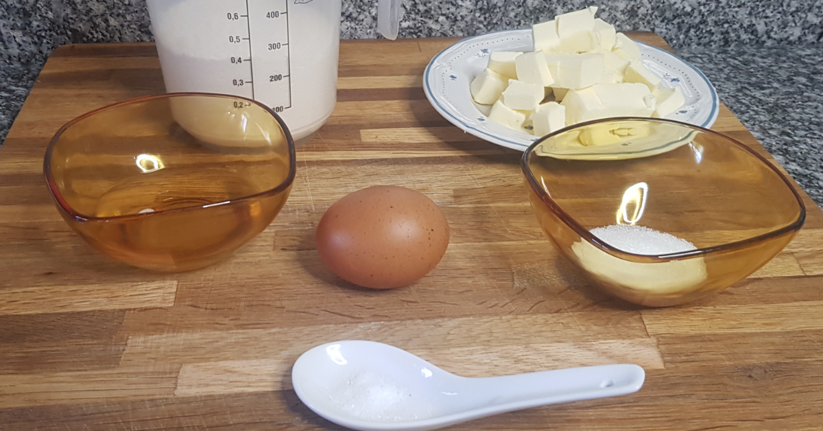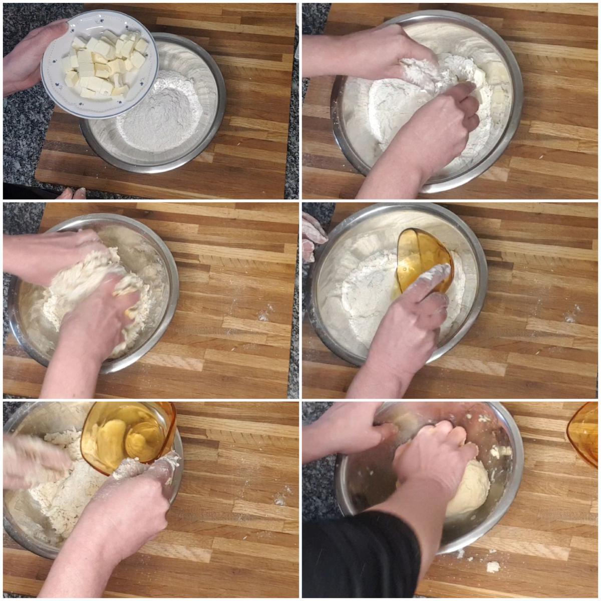 Preparar la masa En un bol añadimos los dados de mantequilla, con la harina y vamos mezclando, pellizcando la mantequilla con la harina y así ir deshaciendo la mantequilla, hasta que quede bien integrado, dejando una mezcla como arenosa. Entonces le añadimos el huevo batido, el azúcar y la pizca de sal, y mezclamos para integrar bien todos los ingredientes, añadir un chorrito de agua fría, mezclar hasta poder hacer una bola de masa. No tiene que quedar pegajosa, si es así amasar un poco más hasta que la masa no se os peque. No añadir más harina.