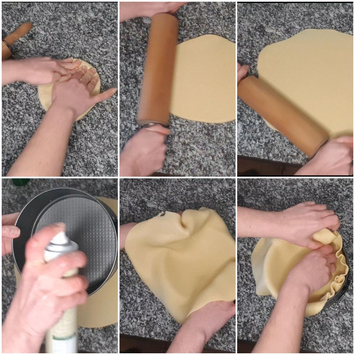 Hornear la masa Estiramos la masa lo suficiente para cubrir el molde, tendréis que enharinar el molde con mantequilla y harina, o usar spray desmoldable o algo parecido, yo el aerosol que utilizo me va genial. Cortamos el exceso de masa. Pinchar la masa con un tenedor para que no se infle. Hornear a 180ºC durante 15/20 minutos. El horno tiene que estar previamente precalentado. Dejamos enfriar sobre una rejilla.