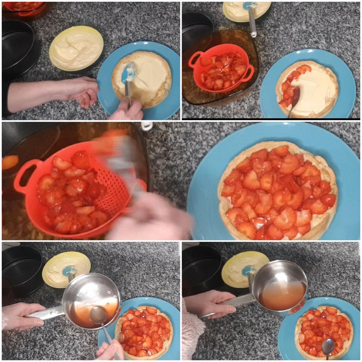 Montar la tarta Desmoldamos la masa quebrada y la ponemos en el plato para servir, le añadimos la crema pastelera y alisamos para que quede parejo. Encima pondremos las fresas maceradas, pero reservaremos un par de cucharadas para la decoración, todas las demás las pondremos encima de la crema, organizaditas, para que toda la tarta quede cubierta. Encima de las fresas añadiremos el jugo que ya no tiene que estar caliente, y reservaremos en la nevera una hora mínimo para que cuaje la gelatina.