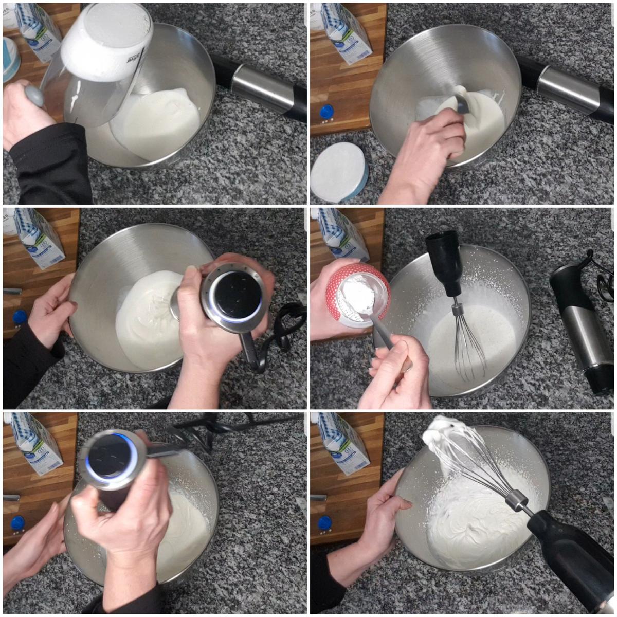 Preparar la nata (crema de leche) Añadimos en el bol de la batidora la nata (crema de leche) y el mascarpone, ambos muy fríos. Batimos a velocidad media hasta que empiece a espumar, entonces añadir el azúcar glass y batir hasta que quede montada del todo.