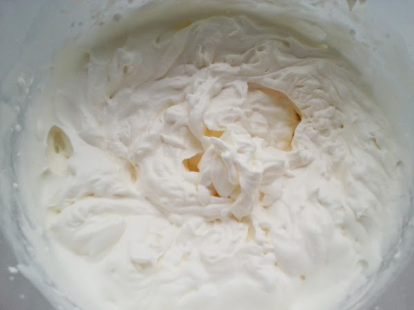 2. - Mientras se templa, montaremos la nata (crema de leche) junto con las 3 cucharadas de azúcar restantes (esto es a gusto del consumidor), si os gusta más dulce la nata (crema de leche), podéis añadir más azúcar, pero hay que tener en cuenta que el almíbar le va a añadir dulzor al conjunto.