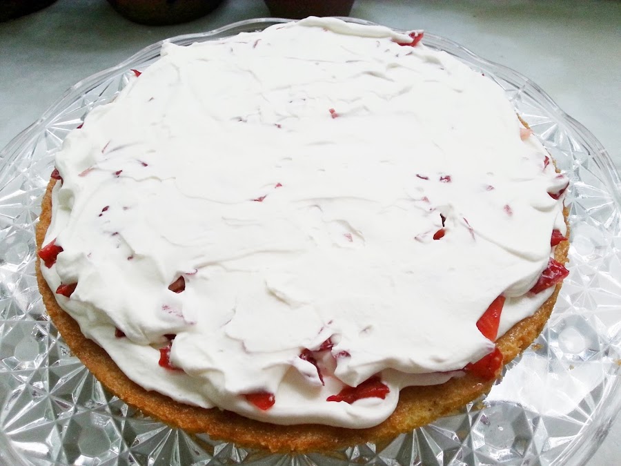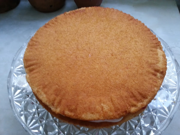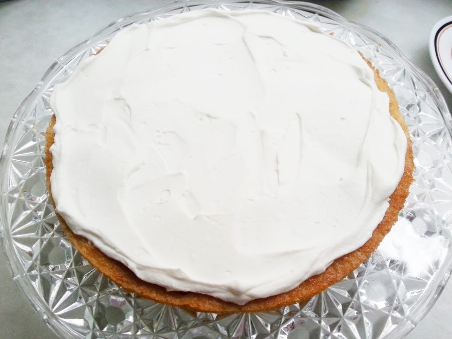 10. - Volvemos a cubrir de nata (crema de leche) y le colocamos la otra base de bizcocho encima, que volveremos a regar con el almíbar.