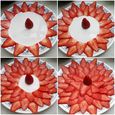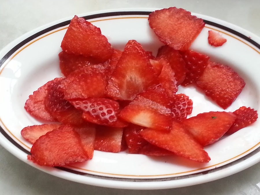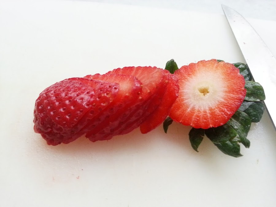 4. - Y cortamos las fresas o fresones, reservando uno entero para el centro. Primero los enjuagamos y los vamos cortando en finas rodajas, quitándoles antes la parte blanca que está cerca de las hojas.