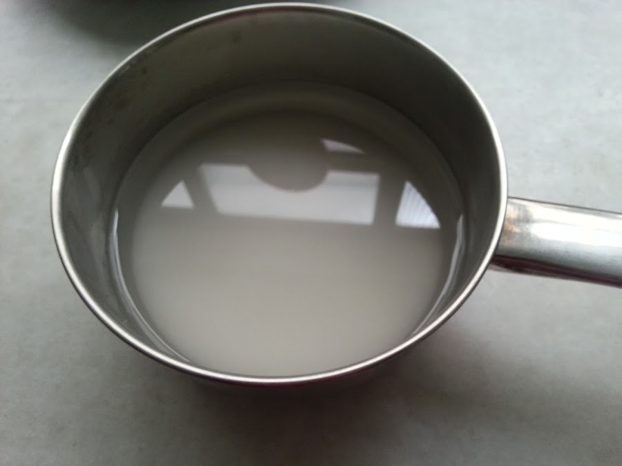 1.- Lo primero que haremos será reparar un almíbar clarito, con el vaso de agua y 5 cucharadas de azúcar, que pondremos en un cazo a hervir durante 5 minutos. Y lo dejamos templar.