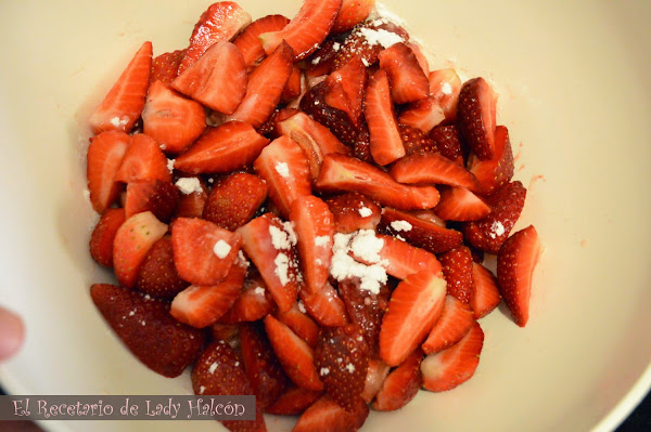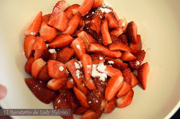 Limpia las fresas y córtalas en trozos más o menos grandes, según te guste. Ponlas en un bol, añade una cucharada sopera de azúcar glass y remueve para que se reparta bien. Mételas en el frigorífico para que se maceren hasta que el bizcocho esté frío.