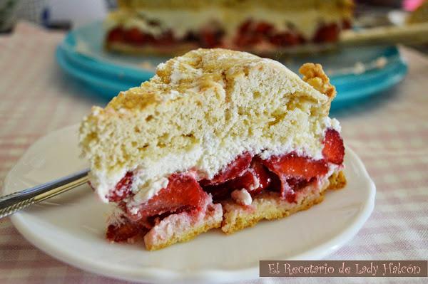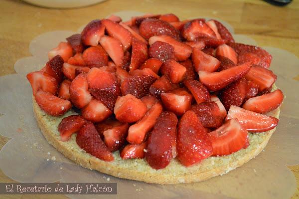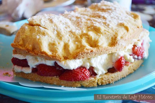 Ya solo queda añadir por encima la nata montada (crema de leche) cubriendo todas las fresas y, por último, la parte superior del bizcocho. Si quieres puedes añadir un poco más de azúcar glass por encima.