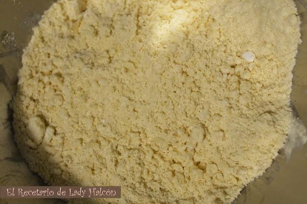 Tamiza la harina, la levadura y el azúcar glass y mézclalo. Añade la mantequilla a dados y mezcla los ingredientes con los dedos, hasta conseguir una textura parecida a las migas de pan.