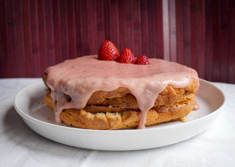 Cuando esté cocido y frío se parte por la mitad de manera horizontal, empapamos la primera base con el brandy y se cubre con la mermelada de fresa, un consejo: buscar una marca que no sea muy dulce. Se coloca la otra base por encima y se vuelve a emborrachar al bizcocho.