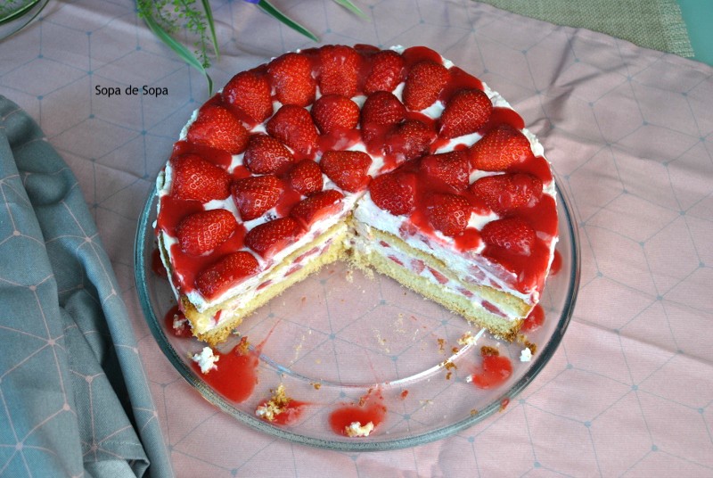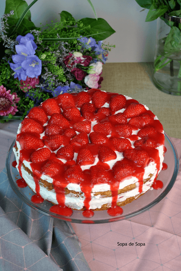 Colocar encima las fresas cortadas por la mitad y meter la tarta en la nevera de 4-5 horas.