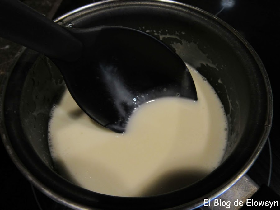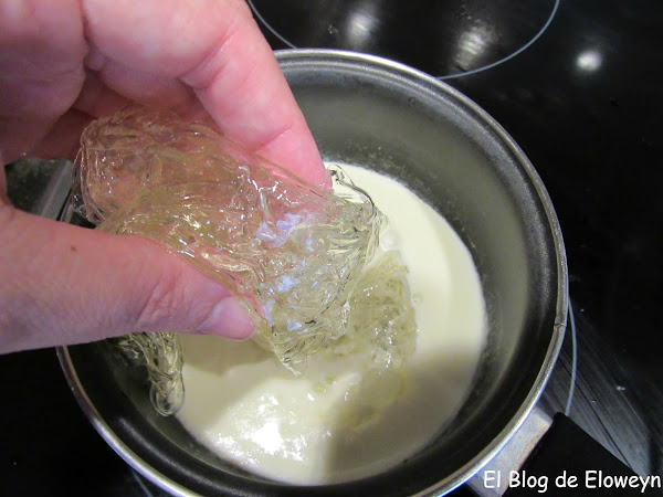 Ponemos a calentar el cazo, removiendo continuamente, hasta que la nata (crema de leche) líquida comience a hervir. Una vez comience a hervir, paramos el fuego, escurrimos las láminas de gelatina ya hidratadas y las añadimos al cazo.
