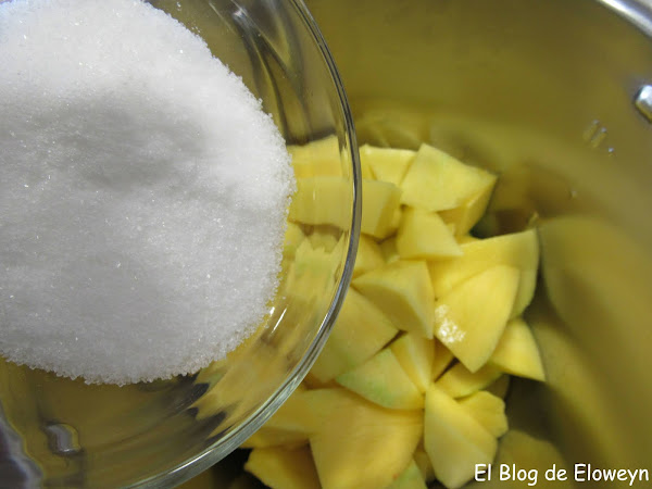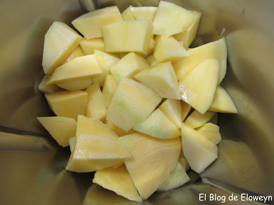 Con Thermomix: Introducimos los 550 gramos de mango partido en trozos en el vaso de la Thermomix.