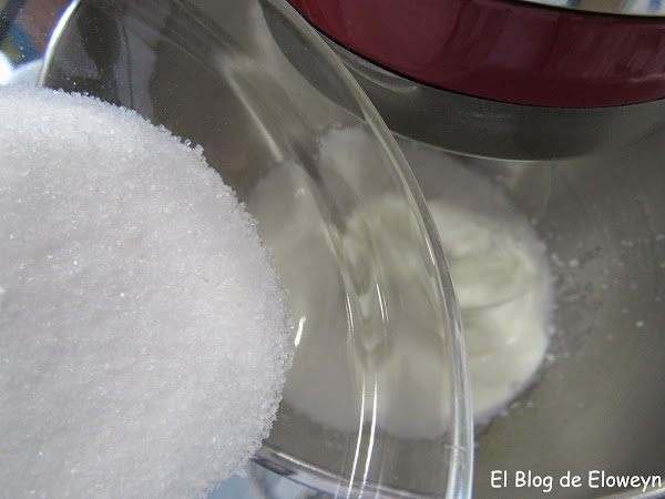 Con Thermomix: Montamos la nata (crema de leche) a velocidad 3 y medio, sin velocidad. Cuando esté a medio montar, añadimos los 50 gramos de azúcar sin parar de batir.
