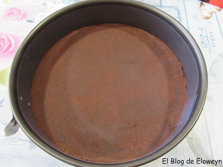 Ponemos la mezcla de la base en el molde y lo aplanamos con una cuchara. Tiene que quedar más o menos así: