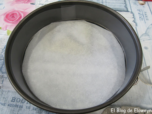 Preparamos un molde desmontable de unos 26 centímetros de diámetro. Os aconsejo que en la base pongáis papel vegetal y en los bordes, una lámina de acetato de la siguiente forma:
