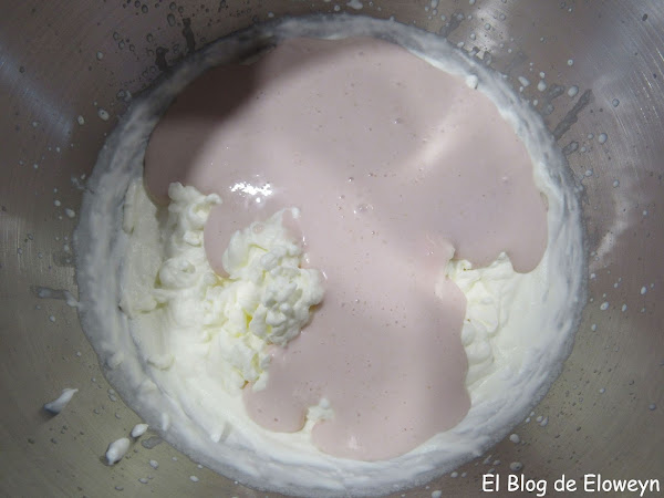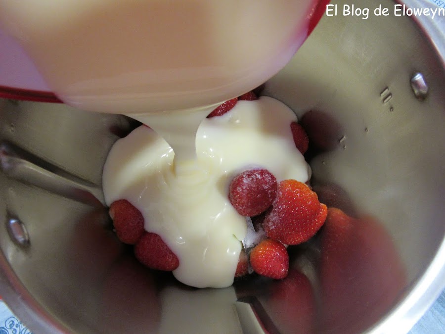 A continuación, añadimos nata (crema de leche) líquida que contiene la gelatina a la mezcla donde están las fresas.