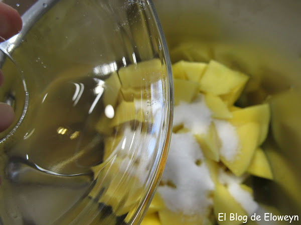 Opcionalmente, le añadimos los 2 gramos de vinagre de manzana. Os recomiendo añadirlo. No notaréis el sabor, pero el vinagre realza el sabor del mango.