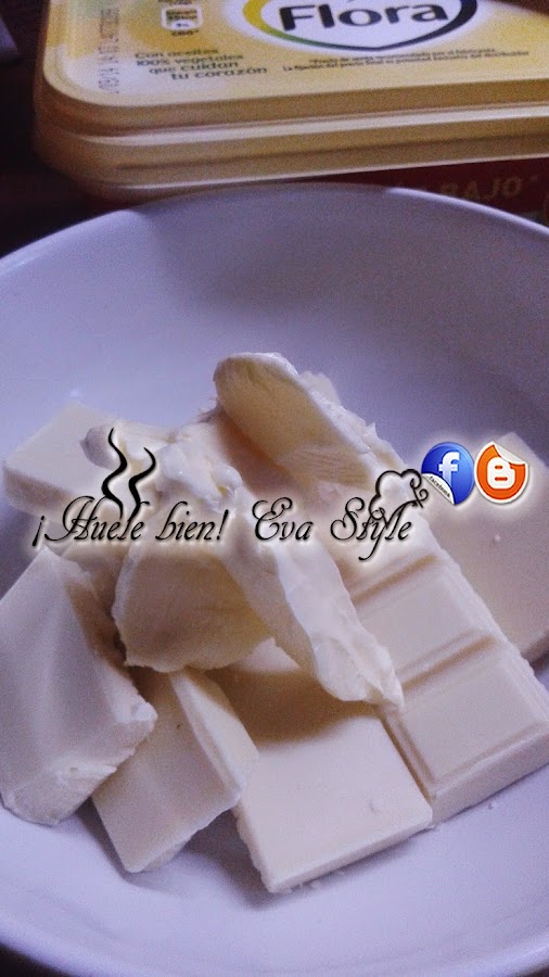 1.- Con dos cuchara de margarina fundimos el chocolate en el microondas, unos 20 segundos. Después añadimos el resto de la margarina hasta que se funda con el chocolate y se forme una pasta.