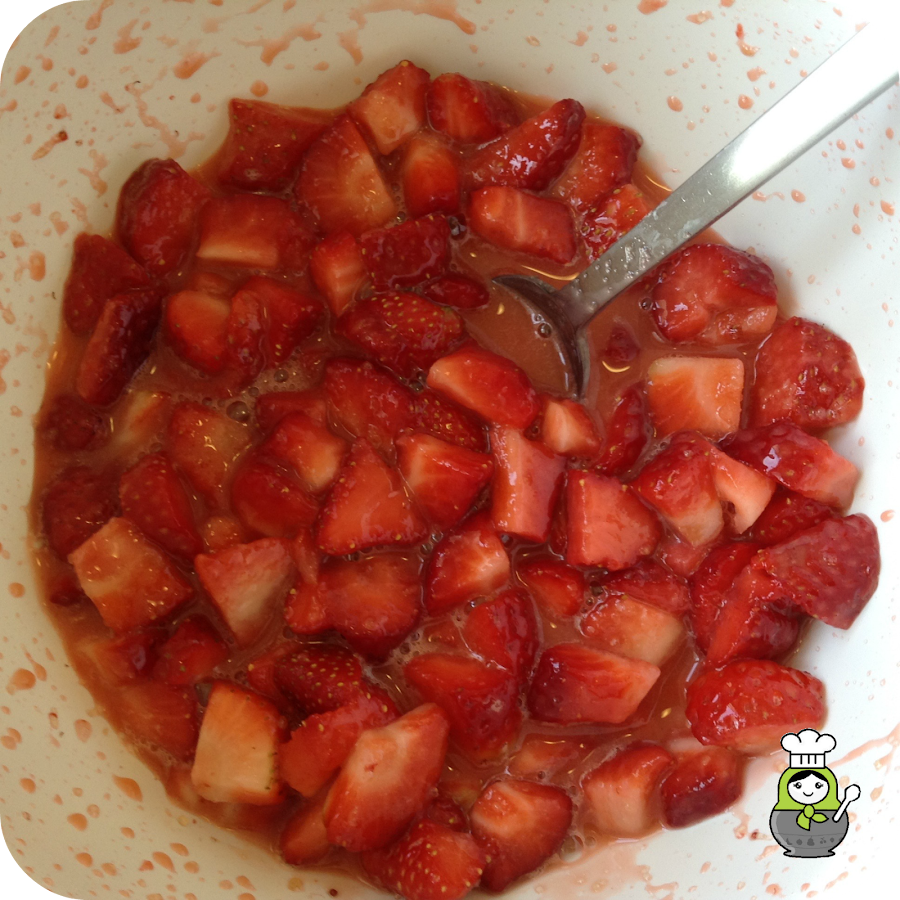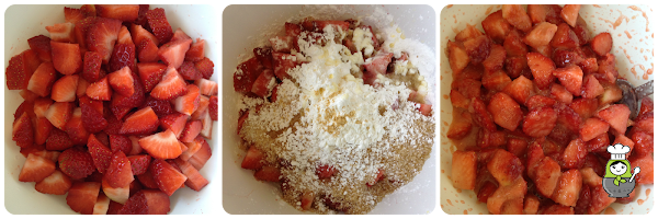 Una vez que tenemos la masa lista, vamos a hacer el relleno. Para ello primero tenemos que lavar las fresas y cortarlas en trozos no muy pequeños (para que no se deshagan del todo en el horno). Una vez cortadas las ponemos en un bol y añadimos el azúcar (blanco y moreno), la maizena, el zumo de naranja y el jengibre. Revolvemos todo bien hasta que la maicena se disuelva y dejamos reposar durante 10 minutos.