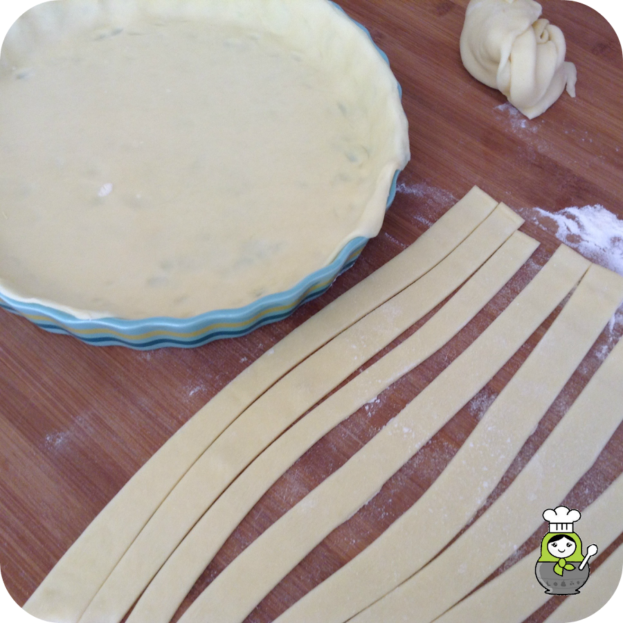 En este tiempo vamos a cortar las tiras de masa para la presentación en rejilla. Estiramos la bola de masa que habíamos reservado y con la ayuda de un cortador de pizza o de un cuchillo, cortamos tiras horizontales de unos dos centímetros de ancho (el número exacto de tiras dependerá del diámetro de vuestro molde. Yo he necesitado 15).