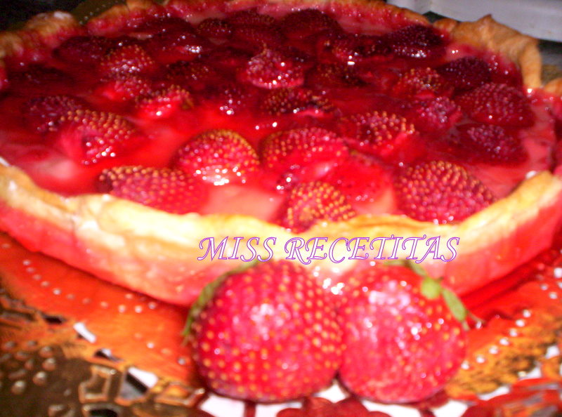 Una vez tengamos el almibar, extendemos encima de la masa de hojaldre unas cuantas cucharadas y metemos la tarta en el honro durante unos 15-20 minutos a 150º vigilando que no se quemen las fresas.