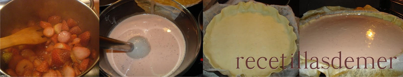 En un bol ponemos la leche condensada, nata (crema de leche), y maicena y mezclamos todo. Después agregamos los huevos y las fresas y batimos todo junto hasta que quede una masa liquida homogenea y sin ningún grumo.