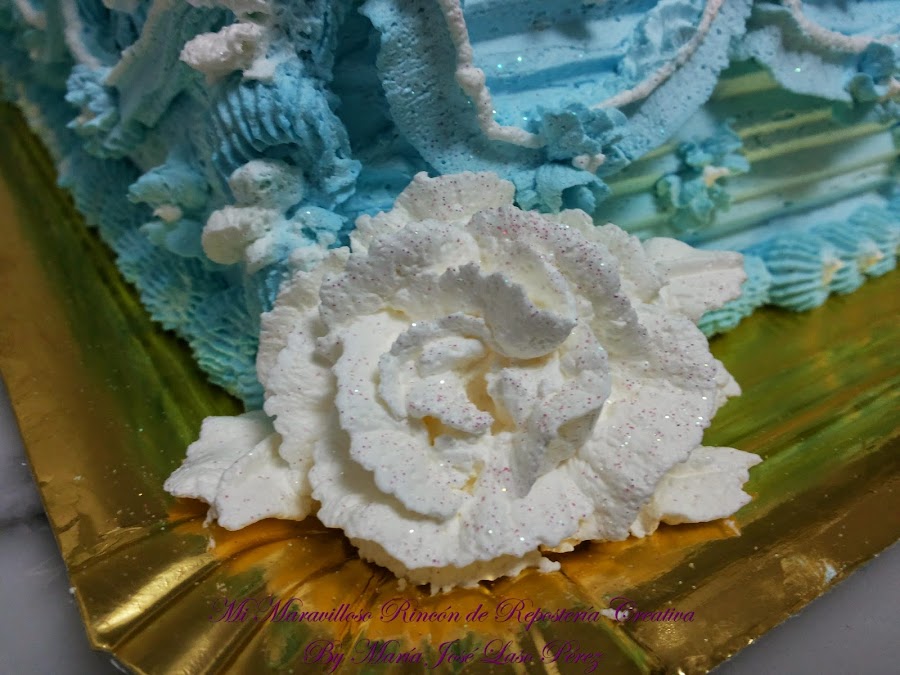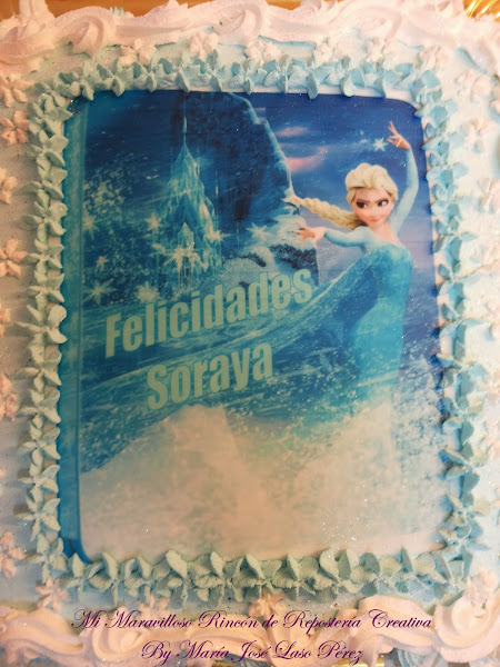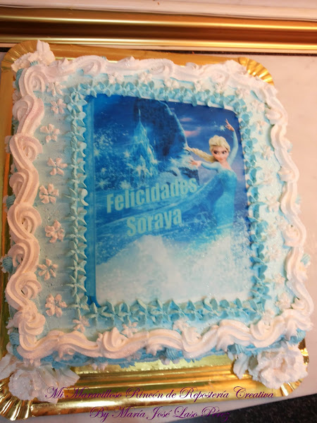 El dibujo es una impresión comestible en papel de azúcar de Elsa, la famosa protagonista de la película. El resto del trabajo está realizado con manga pastelera y con diferentes boquillas: 2, 18, 21, 56 y 104 de Wilton, entre otras.