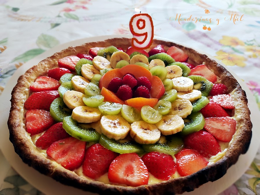 Esta tarta tan rica y bonita la he hecho para celebrar el 9º aniversario del reto Desafío en la cocina. Las jefas del reto, Carolina, Toñi y M Luz, han querido celebrarlo a lo grande, y nos han pedido que hiciéramos una tarta deliciosa y con mucho color....la "Tarta de frutas frescas con crema y base casera"