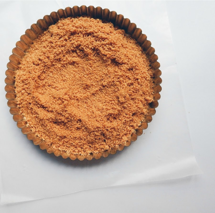 Procesamos las galletas junto con la mantequilla hasta estén bien integrados los ingredientes y se hagan moronitas lo más finas posibles. Ponemos la mezcla sobre un molde de tarta desmoldable de 9.5 inch y esparcimos por todo el molde. Nos ayudamos de una cuchara y/o un vaso con fondo plano para que nos quede bien distribuida la mezcla y parejo.