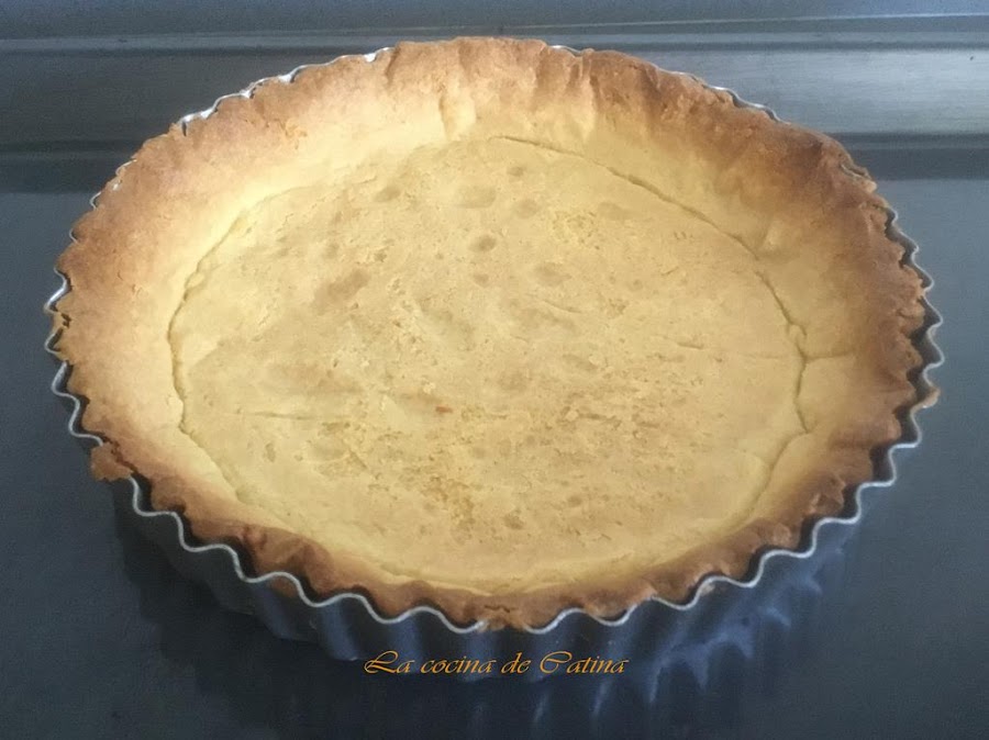 Cubrimos con papel de horno toda la masa y rellenamos el hueco con legumbres (de esta manera evitamos que la base se deforme. Metemos al horno precalentado durante 25 minutos, hasta que la masa esté bien cocida. Sacamos del horno, retiramos las legumbres y dejamos enfriar.