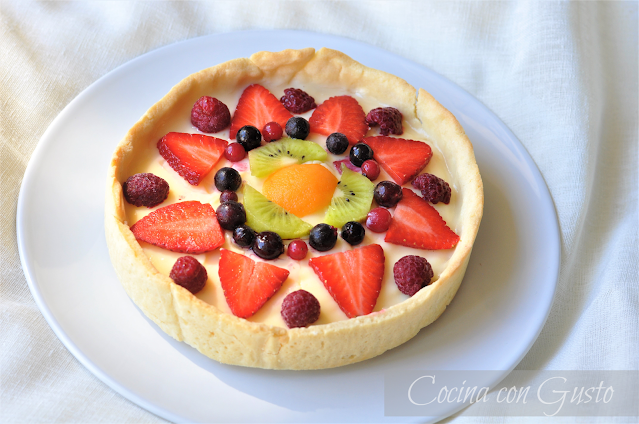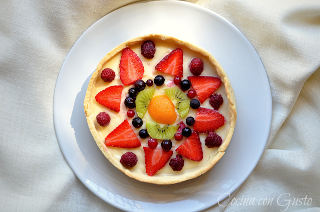 Cuando tengamos todo templado-frio montamos la tarta. Sobre la base de masa quebrada ponemos una capa de crema y sobre esta las frutas colocadas como más nos guste. Metemos en la nevera para que esté fresquita cuando vayamos a comerla.