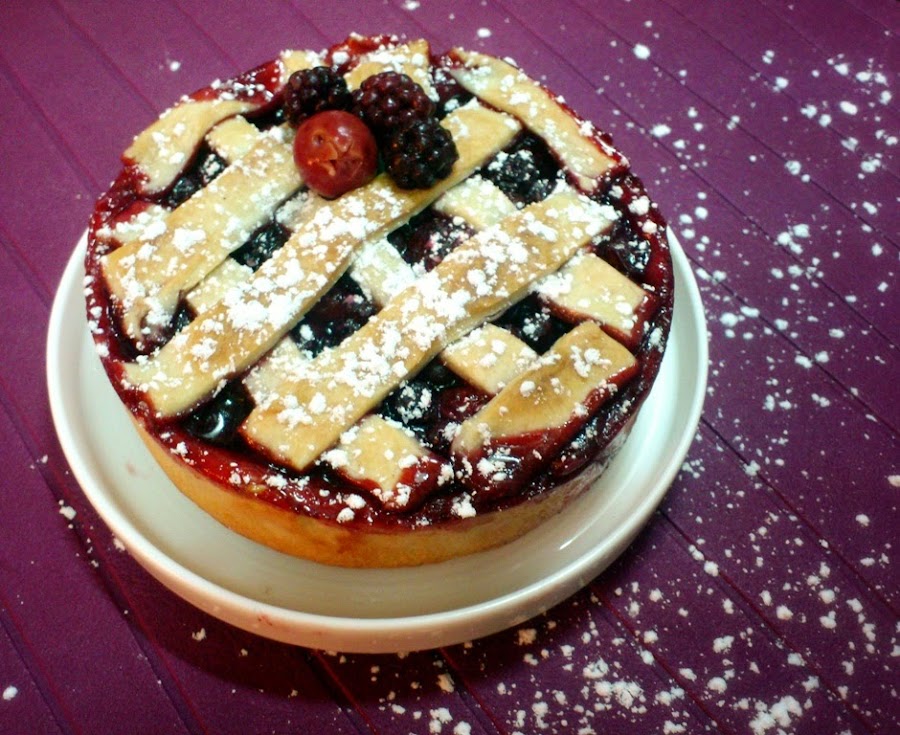 Sacamos y añadimos los frutos rojos con el almíbar y distribuimos por toda la superficie de la tarta. Para cerrarlo colocaremos varias tiras de masa haciendo un enrejado. Volvemos a meter en el horno durante unos 15-20 minutos, dependiendo un poco de cada horno en concreto. El punto será cuando empiece a estar un poco tostada la masa.