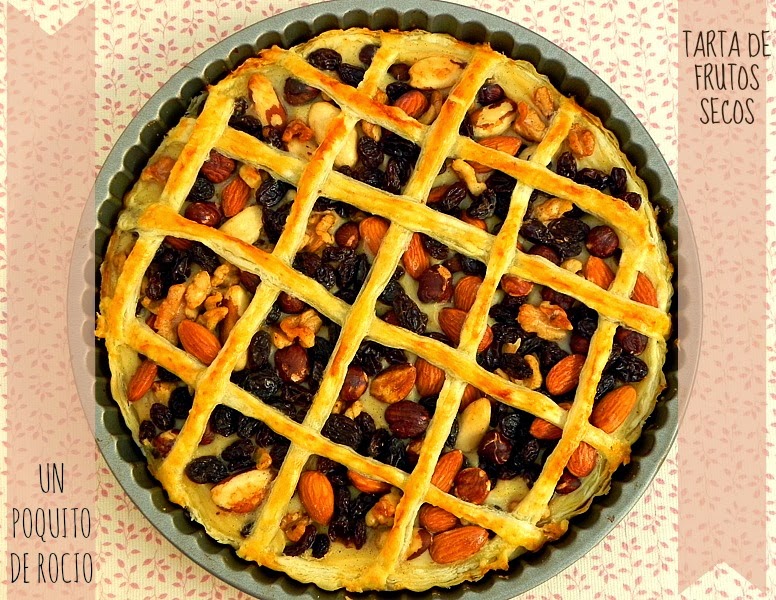 Cuando sacamos el hojaldre, que estará empezando a hacerse, quitamos el papel con sus pesos y llenamos de crema pastelera, poniendo encima de esta cubriendo toda la superficie, una mezcla de frutos secos Borges y las pasas que teníamos en remojo, bien escurridas.