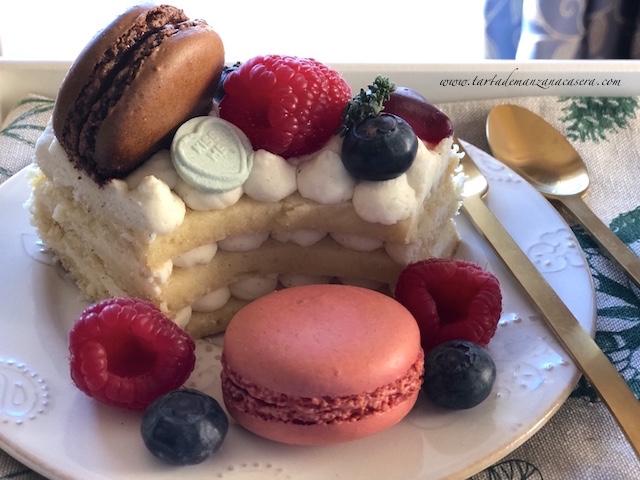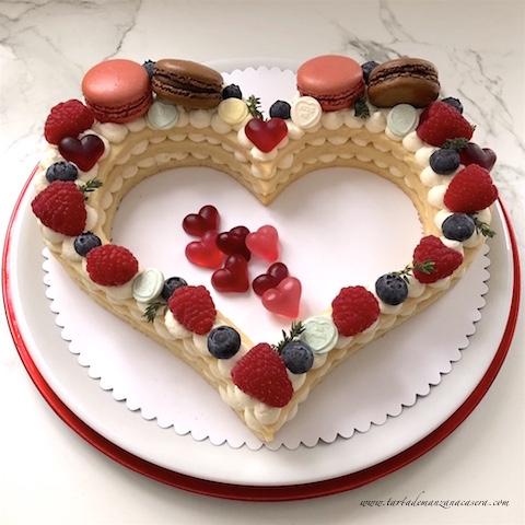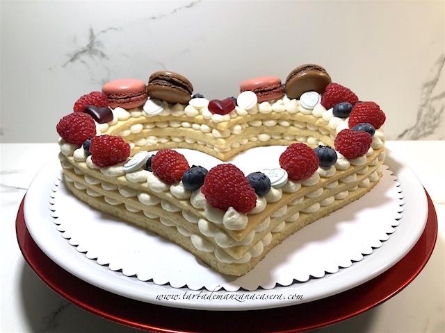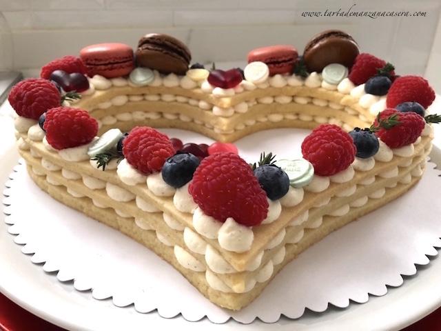 Hoy no os traigo receta, sólo el resultado. Las prisas no son buenas y no me dio tiempo a hacer fotos del paso a paso. Hay gente que me dice que de dónde saco el tiempo para hacer estos postres. Pues os digo cómo fue mi día 14 de febrero: me levanté con las niñas, nos arreglamos y desayunamos, las acompañé al cole, me fui al hospital a trabajar de 10 a 15h y salí de allí ya comida, volví a casa y llegué sobre las 15:45h ó 16h. Nada más llegar formé la masa de galleta de almendra, la dejé reposar en la nevera y me fui a recoger a las peques. Volvimos a casa y preparé la merienda, mientras hacían los deberes horneé con la misma masa 3 grandes corazones y las dejé reposar. Nos arreglamos y salimos pitando. Justamente esa misma tarde a las 19h en la SGAE de Valencia actuaba mi amigo Francisco con su cuarteto de cuerda London City Quartet. Él vive en Londres, así que, teniendo la oportunidad de ir a ver uno de sus conciertos de música clásica con las peques no podía faltar. Fueron 4 obras, una de ellas clásica, otra de un compositor valenciano y otra del compositor catalán David Bozzo. A la vuelta mi marido, que estaba con gripe el pobre, había preparado la cena, cenamos, se acostaron las peques, preparé la crema y adorné la tarta. Eso sí, la dejé en la nevera hasta el día siguiente para que la crema ablandara un poco y humedeciera la galleta, si no, no hay quien se la coma.