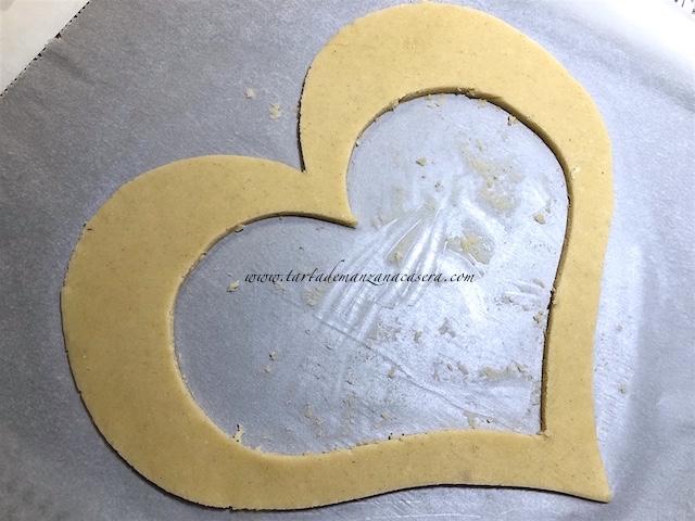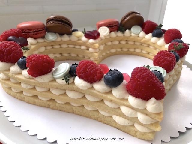 He seguido la receta de Megasilvita al pie de la letra, podéis elegir cualquier receta de galleta que quede bien compacta y lisa como las de mantequilla para decorar o las de chocolate. En el enlace a su receta tenéis la plantilla de medio corazón que yo también he utilizado. La crema de Mascarpone y nata (crema de leche) está muy rica aunque se puede utilizar mejor una SMB para que queden los picos más firmes. Hoy no os traigo la receta, sólo el montaje y el resultado. Esta vez, podéis ver la receta y el paso a paso en el blog de Megasilvita. Yo os enseño cómo me ha quedado a mí.