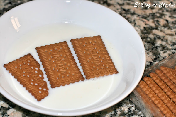 Ahora mojamos las galletas en la leche, pero sin miedo, porque a mi me quedo un poco seca por no mojarlas bastante. Pero cuidado que se rompen!