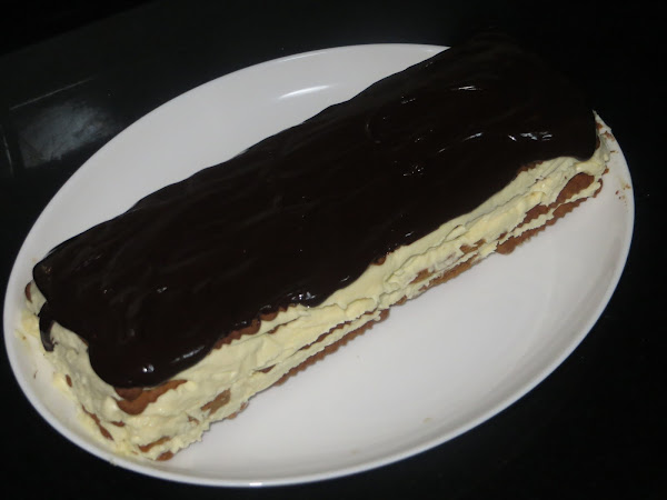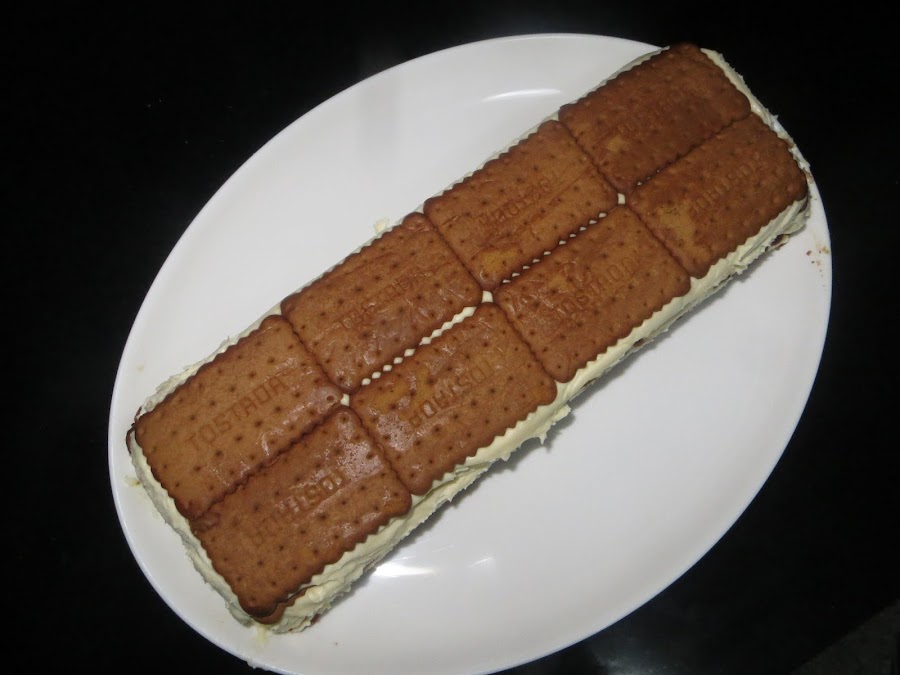 Así vais entrelazando capas de galletas con la crema de queso mascarpone y leche condensada hasta que se os acabe la mezcla, eso sí debéis terminar con una capa de galletas para que cuando le deis la vuelta esto sea vuestra base. Lo dejáis durante cuatro horas en la nevera.