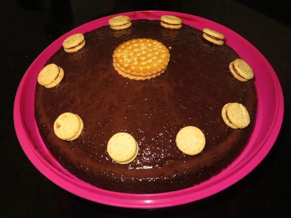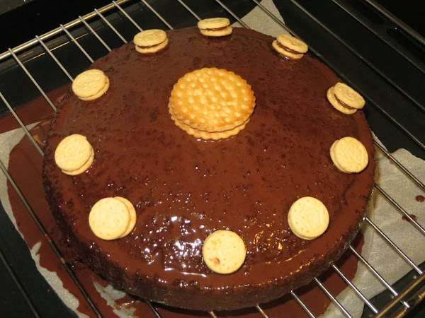 Precalentamos el horno a 180º y metemos la tarta 40 minutos. Ahora hacemos la ganache de chocolate con la nata (crema de leche) y el chocolate y embadurnamos nuestra tarta. Colocamos las minigalletas rellenas de chocolate para decorar y ya está lista para servir.