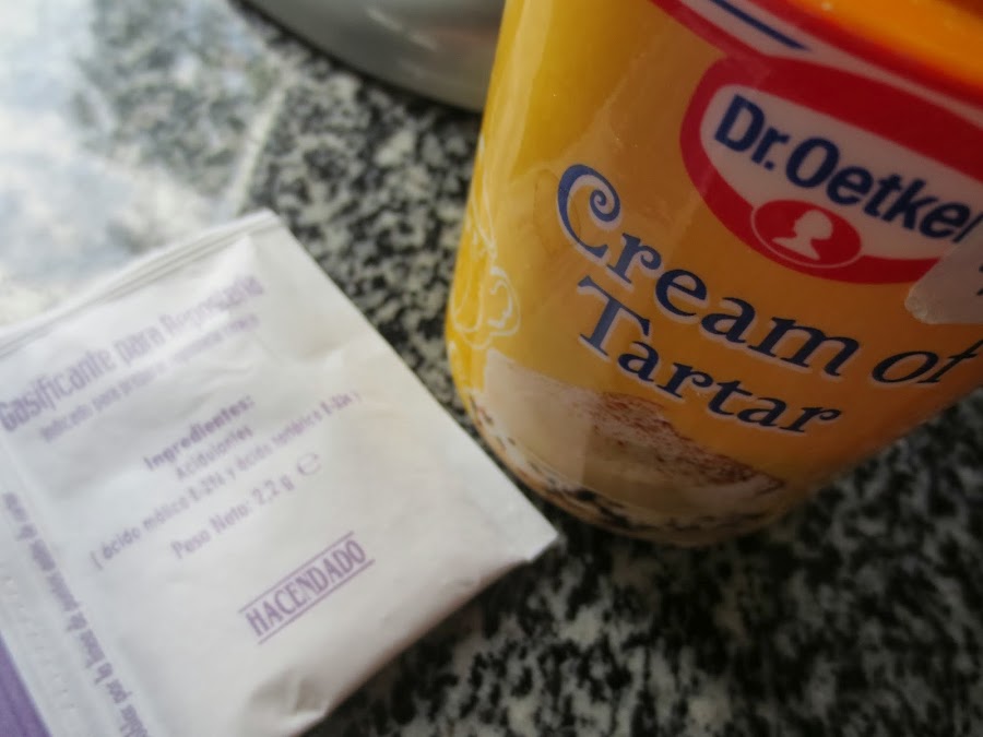 Si no tenéis cremor tártaro, el sobrecito blanco de gasificante, os sirve igualmente para hacer el merengue