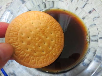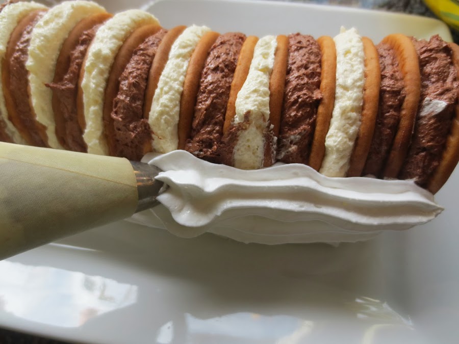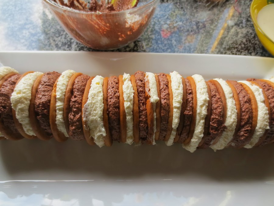 4- Ir remojando cada galleta unos segundos en la leche o café con brandy, (Sin pasarse para que no se rompa la galleta, yo cuento rápido 6,jejejej), poner una cucharadita de cada mezcla, alternándolas y pegar formando un tronco. (fotos).