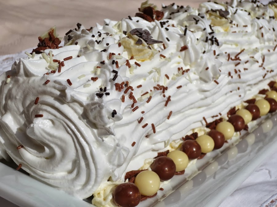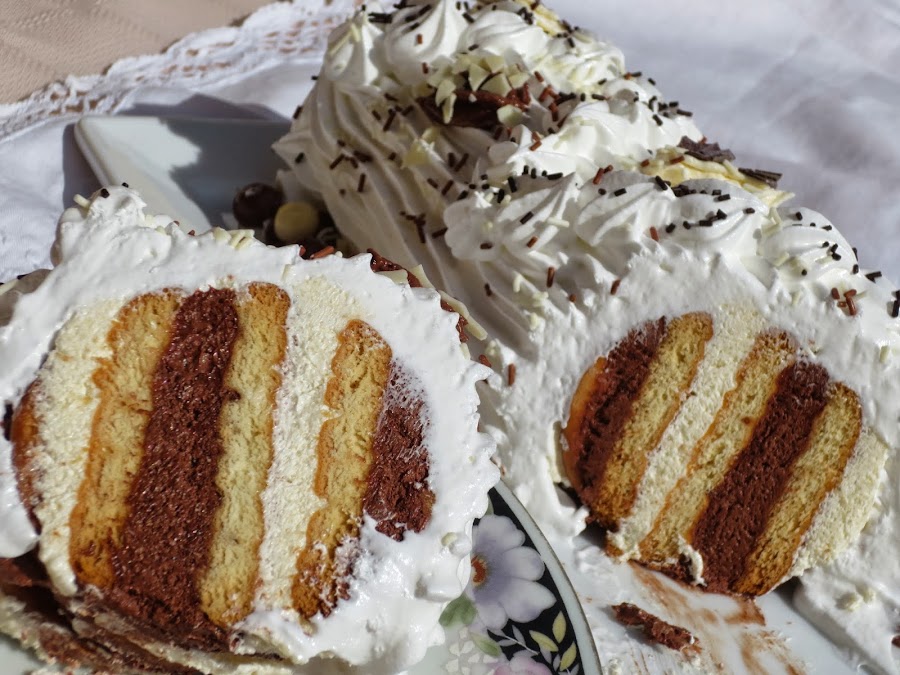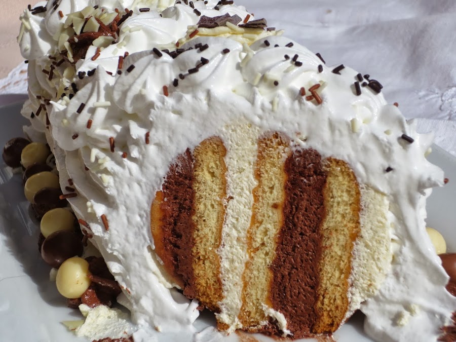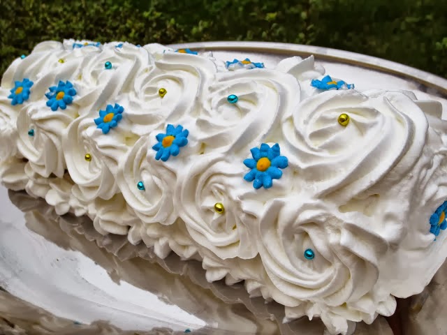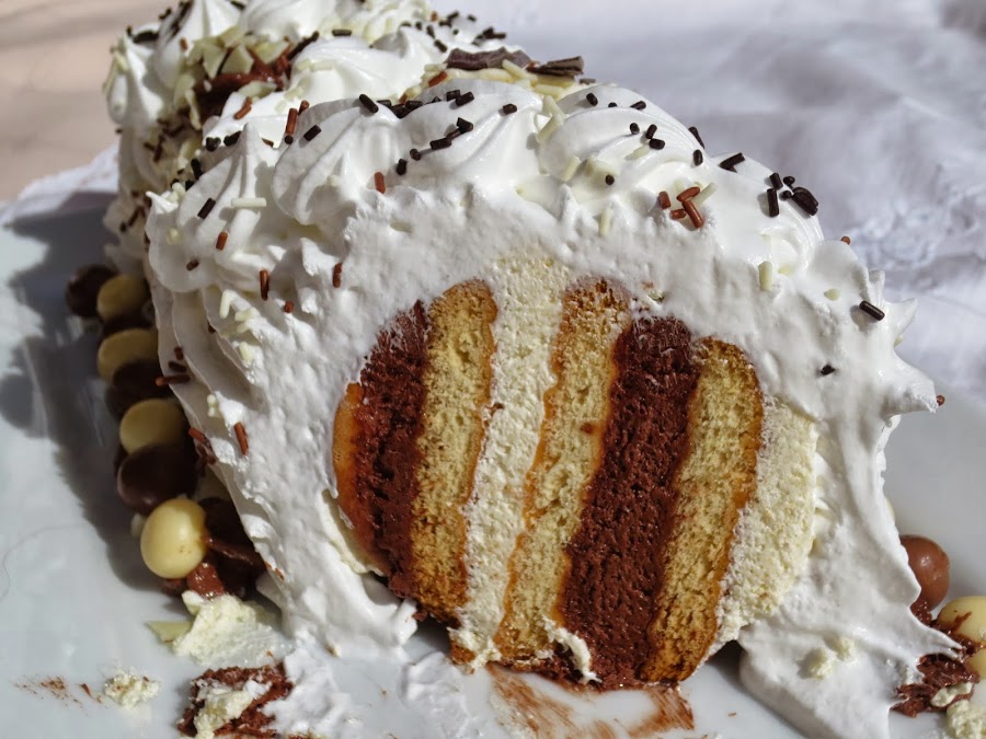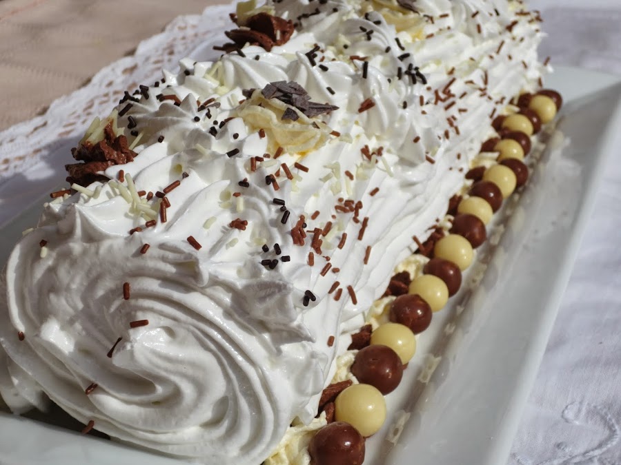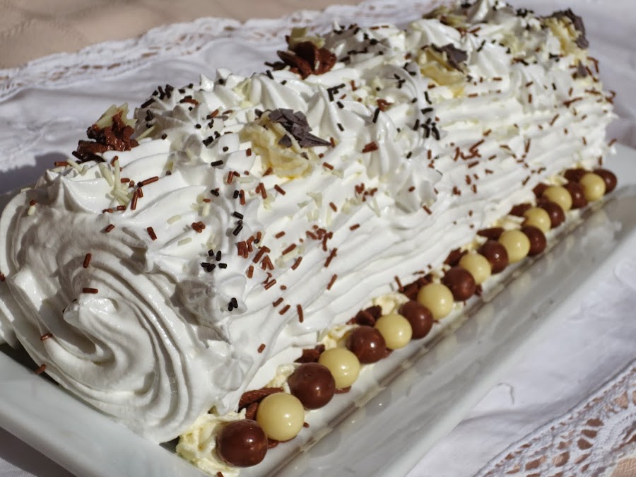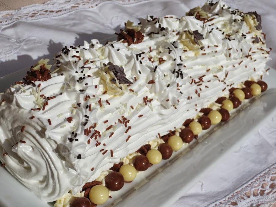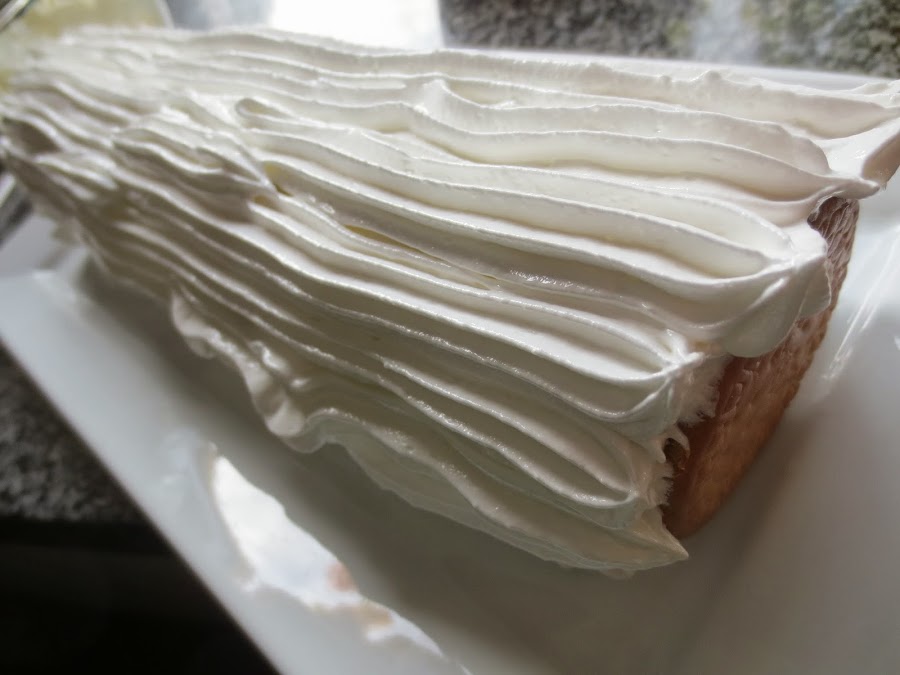 5- Cubrir con el merengue, adornar a gustos y llevar a la nevera. SE CORTA EN BISEL EH? PARA QUE QUEDEN LAS CAPITAS DE CREMA VISTAS.