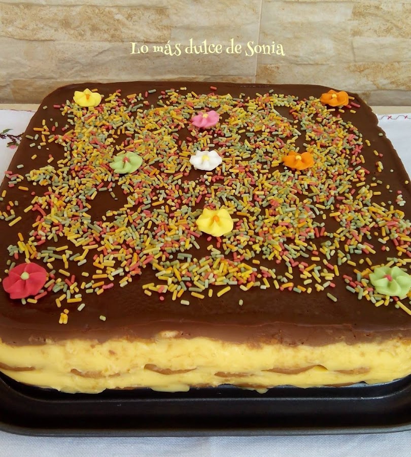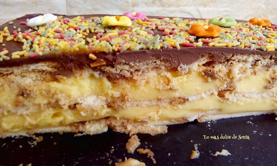 Preparamos nuestro molde y vamos remojando las galletas (meter y sacar, no mojarlas demasiado) en el café con el licor o en la leche. Vamos colocando la primera capa de galletas tapando todos los huecos. Iremos alternando capas de galleta, flan, galleta, flan. Hay que empezar y acabar con galleta. No tardéis mucho en hacerla que el flan espesa muy rápido.