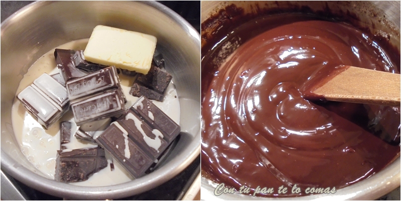 1. Derrite al baño maría el chocolate con la nata (crema de leche) y la mantequilla.