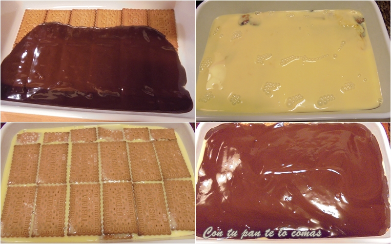 Por si no la conoces, se trata de hacer capas con galletas, chocolate y además en este caso preparado de flan o natillas de toda la vida. La he visto con nata (crema de leche), con crema y hasta con dulce de leche (además de chocolate), así que puedes dar rienda suelta a tu imaginación hasta donde te permita tu paladar.