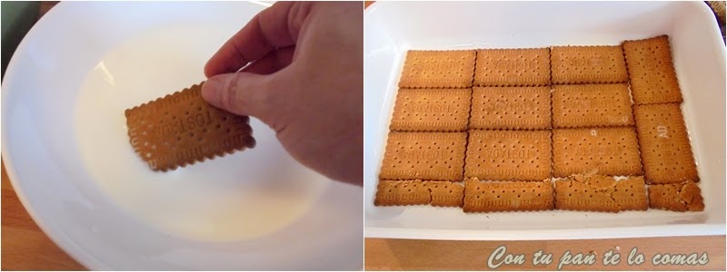 3. Para montar la tarta hay que empezar por mojar las galletas en leche según las vamos poniendo en la fuente. Se trata de mojar simplemente sin empaparlas. Si necesitas cortar alguna para rellenar huecos es mejor que lo hagas una vez mojadas en leche porque se deshacen menos.