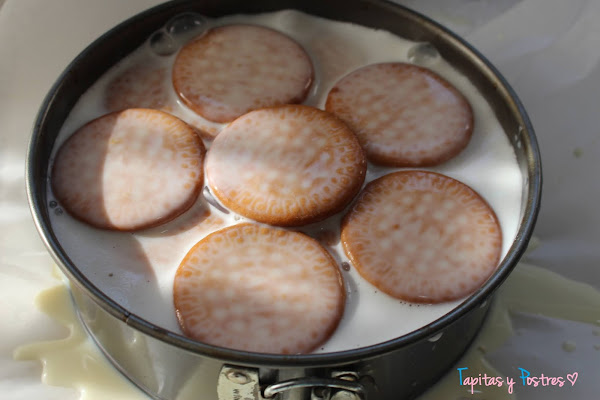 Mientras tanto vamos poniendo en el fondo del molde dos capas de galletas.