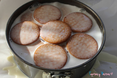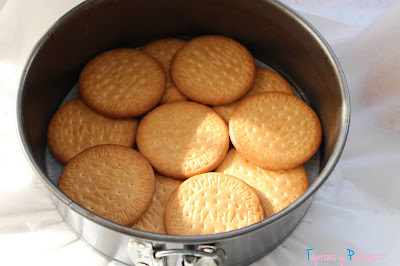 Cuando el relleno de la tarta esté listo lo vertemos con cuidado sobre las capas de galletas. Se subirán hacia la superficie, no os preocupéis. A mi incluso se me salió un poco de relleno...Dejamos en la nevera unas horas, Siempre es mejor hacer el día anterior.