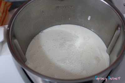 Colocamos la leche, nata (crema de leche), azúcar y los sobres de cuajada en el vaso de la thermomix. Mezclamos 20 segundos a velocidad 3 y luego cocinamos 7 minutos a 90º y velocidad 4.Si no tenemos thermomix podemos calentar la mezcla en un cazo hasta que veamos que espesa.