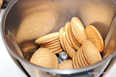 Ponemos las galletas en el vaso de la thermomix o de una picadora y trituramos 10 segundos a velocidad 10.